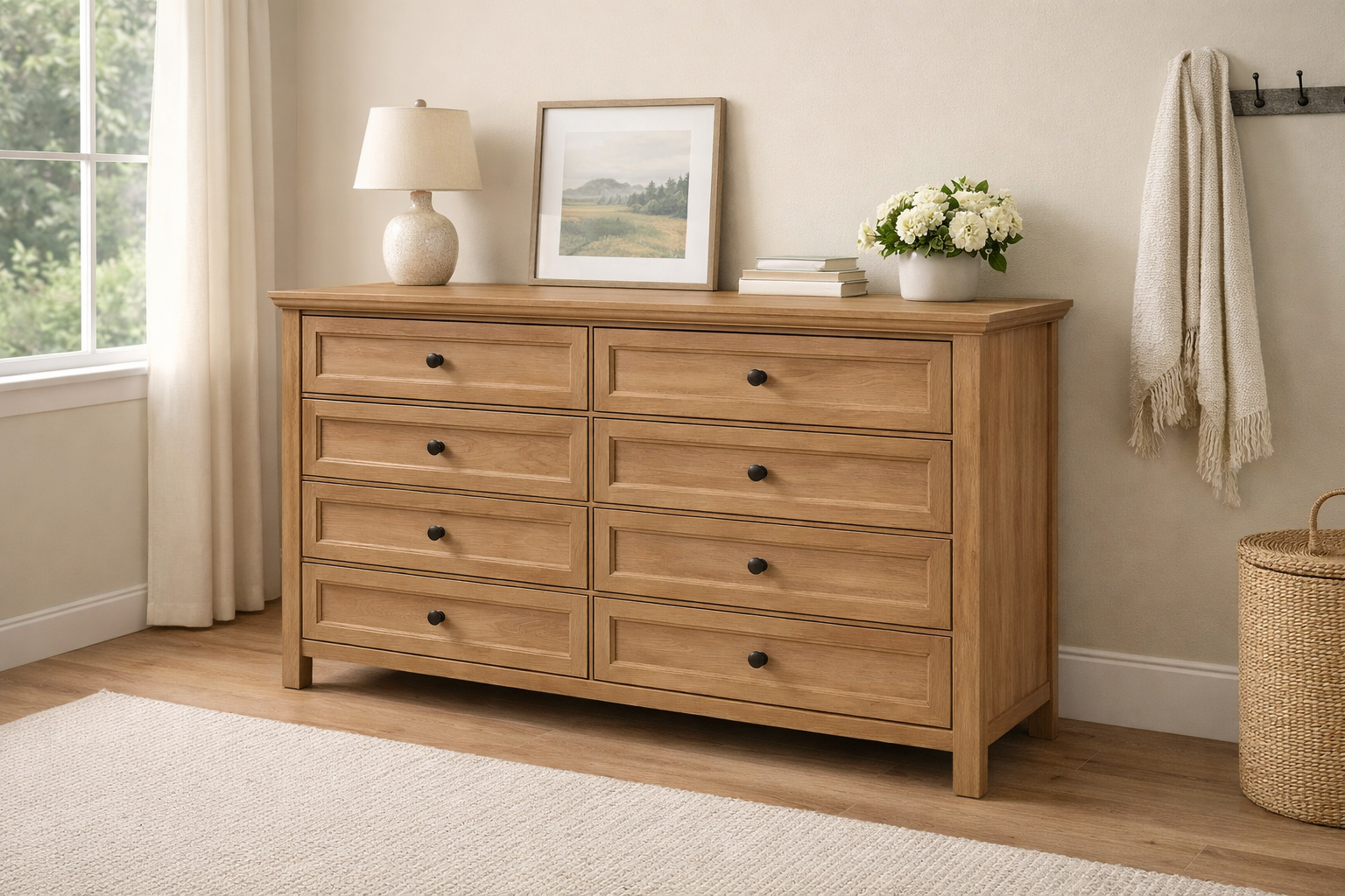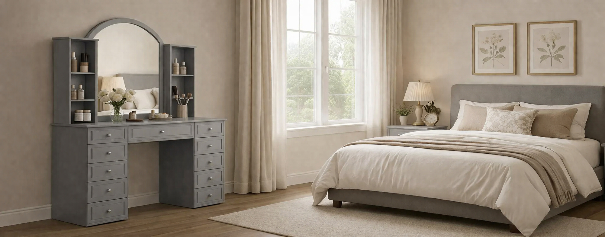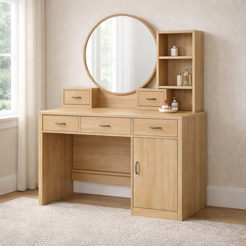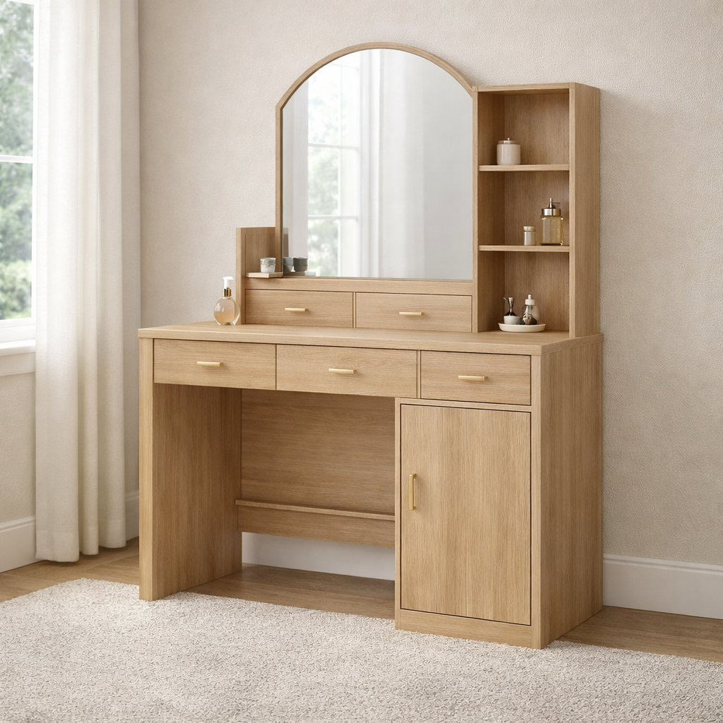 Coiffeuse équipée d’un plateau et de rangements, permettant l’organisation des accessoires personnels dans une chambre ou un espace dédié.