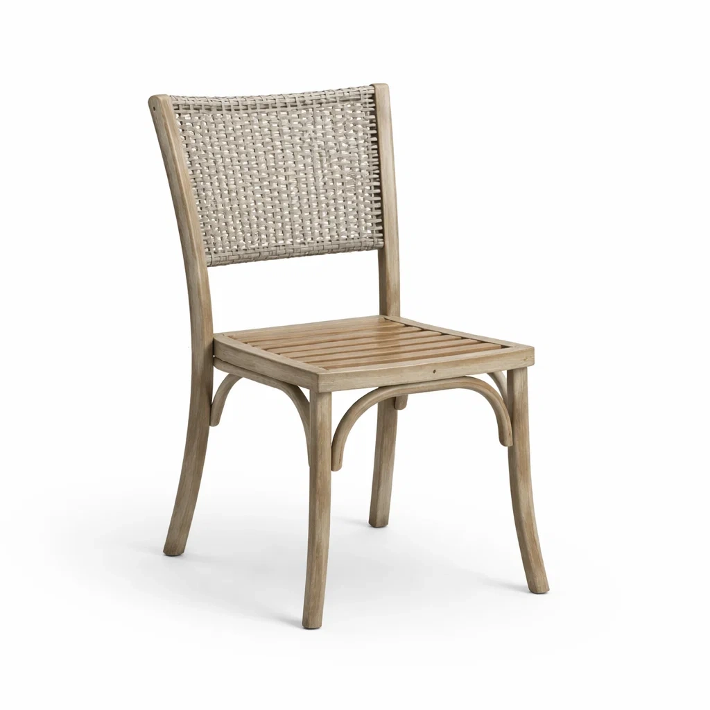 Chaise avec cadre en bois massif et dossier en rotin synthétique. Dimensions : Hauteur 90 cm, Largeur 45 cm, Profondeur 55 cm. Poids net 4.50 kg. Conception avec structure arquée. Non empilable. Usage intérieur. Nettoyage avec un chiffon doux et sec.