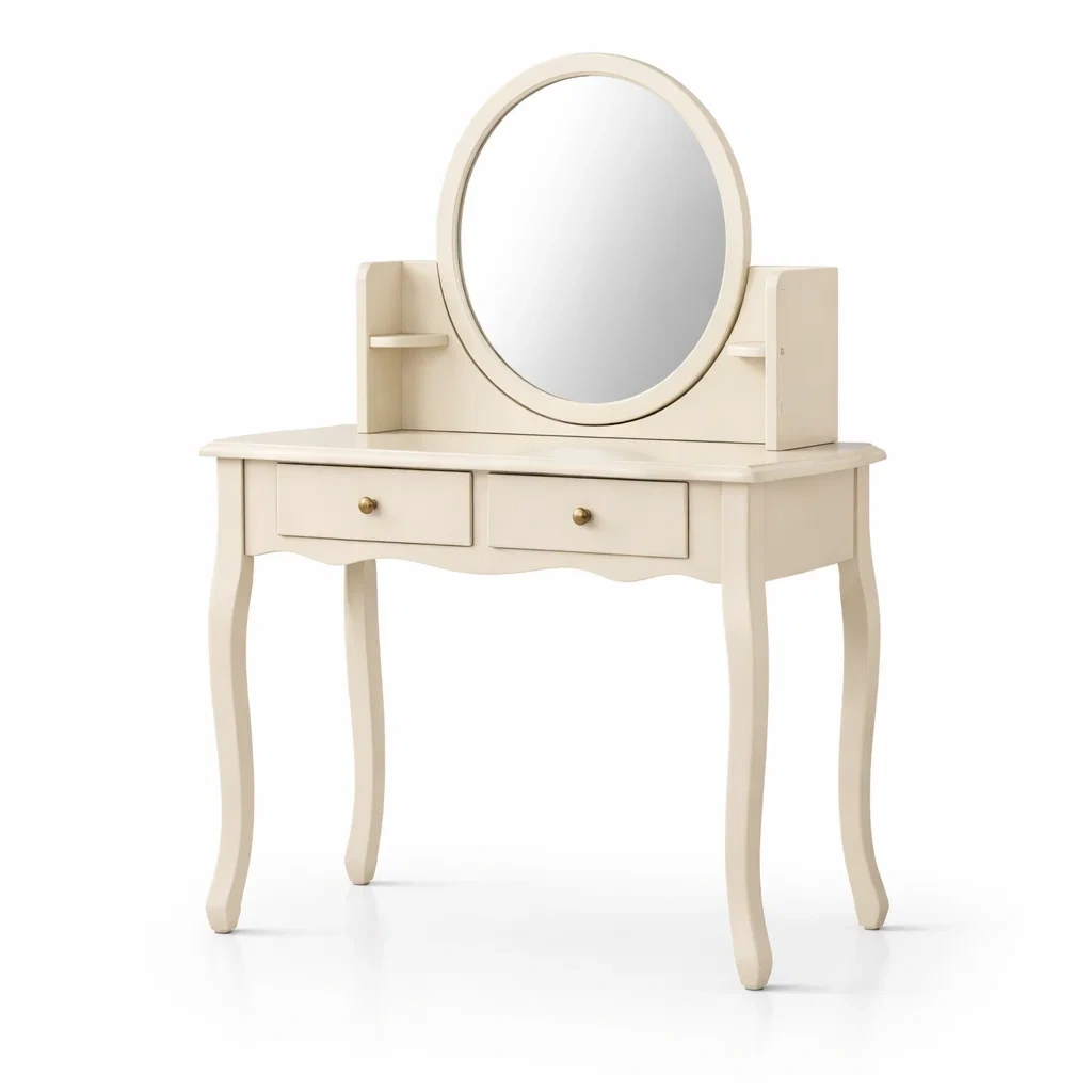 Cette coiffeuse est fabriquée en bois avec une finition crème. Elle comprend un miroir ovale intégré d'environ 50 cm de diamètre et deux tiroirs mesurant environ 40 cm de largeur chacun. Les pieds courbés ajoutent un aspect esthétique. Les dimensions totales sont de 100 cm de longueur, 40 cm de largeur et 130 cm de hauteur. Son poids est de 18 kg.